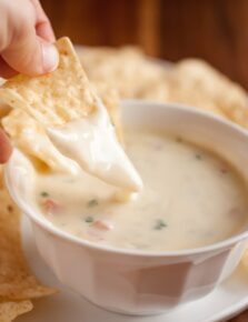 - Immediately stir in cheese and return to low heat and stir to fully melt cheese. Serve warm with tortilla chips for dipping.
