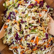 This is the Asian Ramen Chicken Chopped Salad you’ve eaten countless times at potlucks! I added chicken to the salad to make it into a main dish, but this is also a great side salad. You’ll go crazy for the crunchy cabbage and ramen noodles, and don’t even get me started on the tangy dressing!