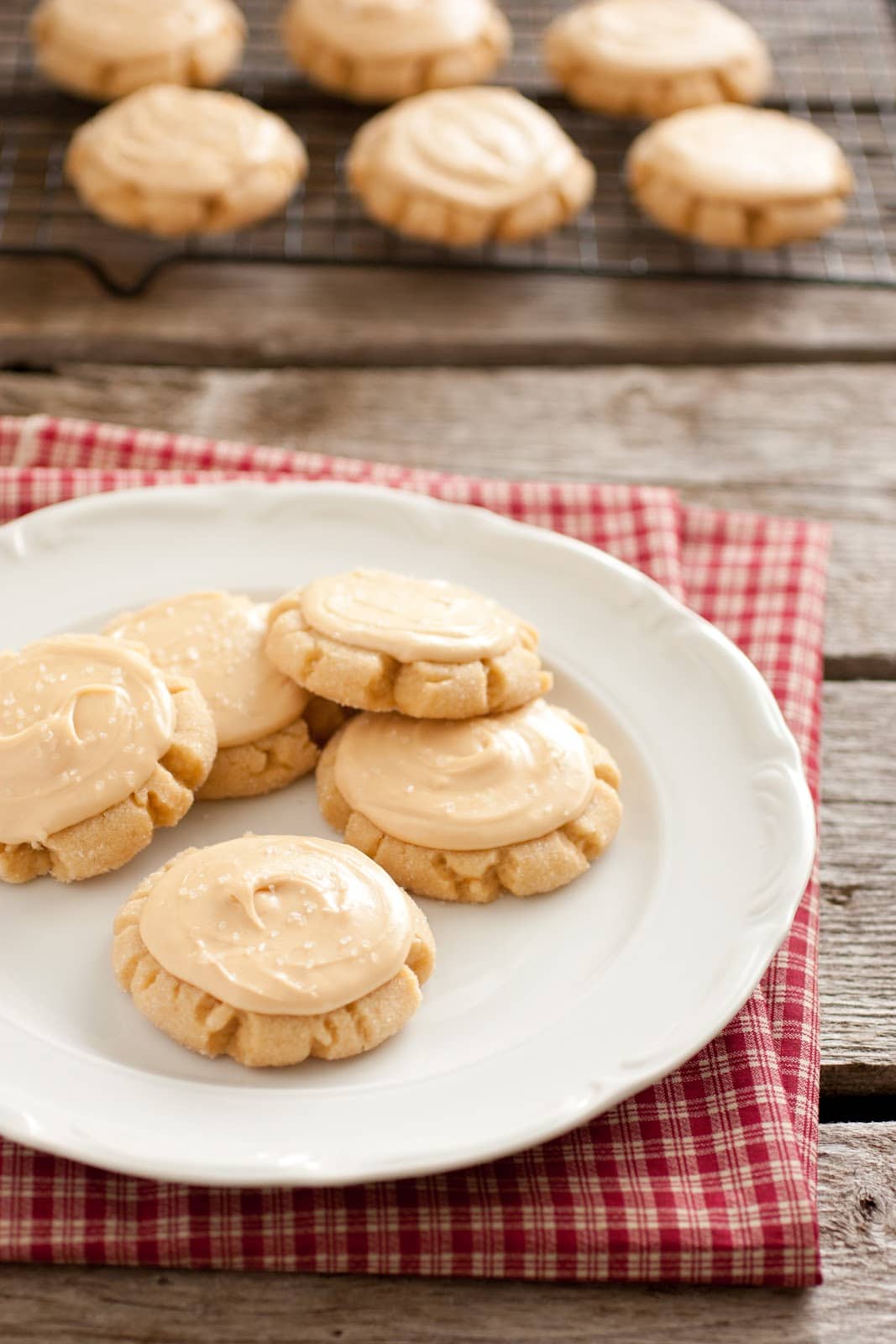- Allow to cool several minutes before transferring to a wire rack to cool. Cool completely then frost each cookie with Salted Caramel Frosting and sprinkle each cookie evenly with a small pinch of sea salt immediately following (so the salt sticks before frosting sets). Store cookies in a single layer in an airtight container.