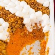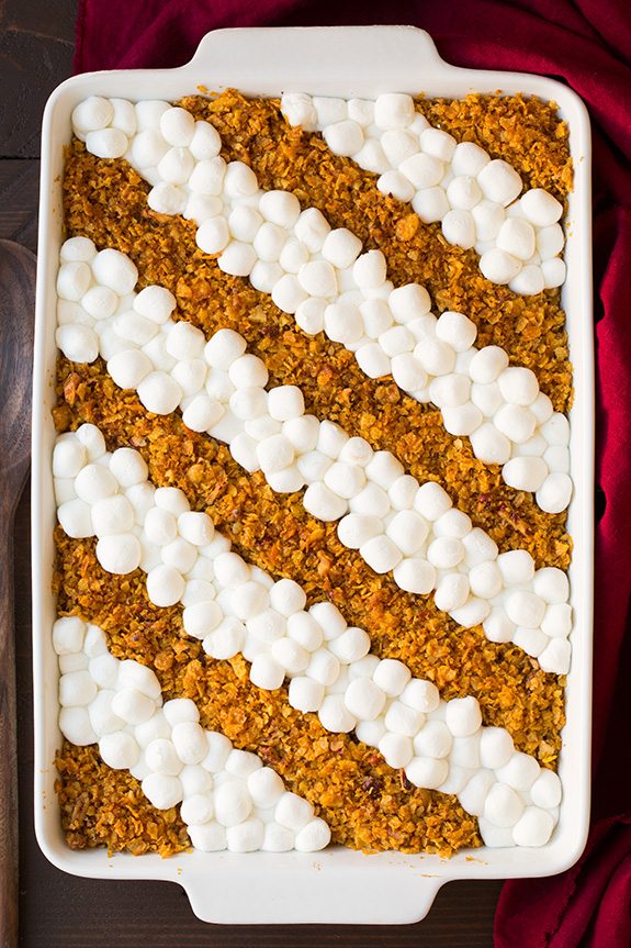 This sweet potato dish has the best of everything and just the right amount of contrast with its creamy sweet potatoes, a sprinkle of gooey melty marshmallows, and that finishing crisp you get from the cornflakes and crunchy pecan topping.