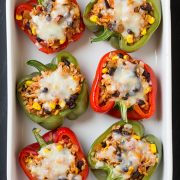These Chicken Stuffed Peppers are filled with black beans, corn, onion, and brown rice â you pretty much have all the food groups in one bite! I love that these healthy stuffed bell peppers are good for you yet full of flavor and taste amazing!Â