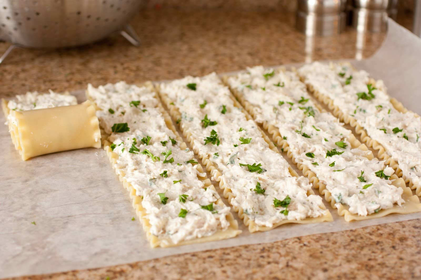 • Spread 1/3 cup of the chicken mixture into an even layer along the length of each cooked lasagna noodle then roll noodles to opposite end. Spread 1/4 cup of the remaining cream cheese mixture along the bottom of a 9 x 9-inch dish. Align pasta snugly and side by side in baking dish - 3 rows of 3.