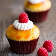 - Allow topping to cool then garnish with whipped cream and a raspberry if desired. Serve immediately (note: the pastry cream can be made the day before and the cupcakes can be made hours ahead of time but top with sugar and caramelize sugar just before serving).