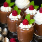 - Top with whipped cream, raspberries, and mint leaves if desired, or top with whipped cream and shaved chocolate if desired.