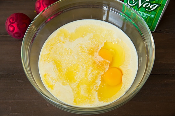 - In a separate mixing bowl, whisk together eggnog, eggs, butter and rum extract until well blended. Pour wet mixture into well in dry mixture and whisk just until combined (small lumps are fine).