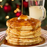 There’s nothing like cozying up in your pj’s and slippers and settling down to a warm holiday breakfast full of freshly squeezed orange juice, hot-from-the-oven perfectly crisp bacon, soft scrambled eggs that are loaded with cheddar, and a tall stack of warm pancakes slathered with butter and drenched in maple syrup.