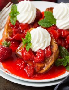 Do you know anyone who doesn’t love the fresh strawberries and cream combination? So when you combine them together along with some tangy cream cheese and add it to the top of a sweet vanilla cake, you know it’s got to be good, and oh, how it is! You’re going to want to eat it by the spoon or maybe just lick the bowl.