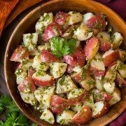 Garlic-Herb Potato Salad is my favorite summer side dish for a lighter potato option—no mayo or eggs here! The fresh and herby flavors with a light vinegar base are absolutely perfect on a soft red potato. You’ll forget all about those creamy and perishable potato salads!