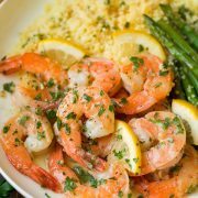 This lemon garlic butter shrimp is the perfect meal for busy weeknights! If you pair it with couscous and asparagus, it all cooks in 10 minutes or less and prep is a breeze!