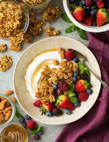 Granola makes an excellent on-the go snack, keep some stashed away at your desk for those midday munchies. Other ways I love to serve it: