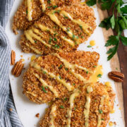 Honey Mustard Pecan-Crusted Chicken – tender chicken breasts are coated with a crispy panko pecan mixture, oven baked, then finished with a fair drizzling of honey mustard glaze. So delicious in every way!
