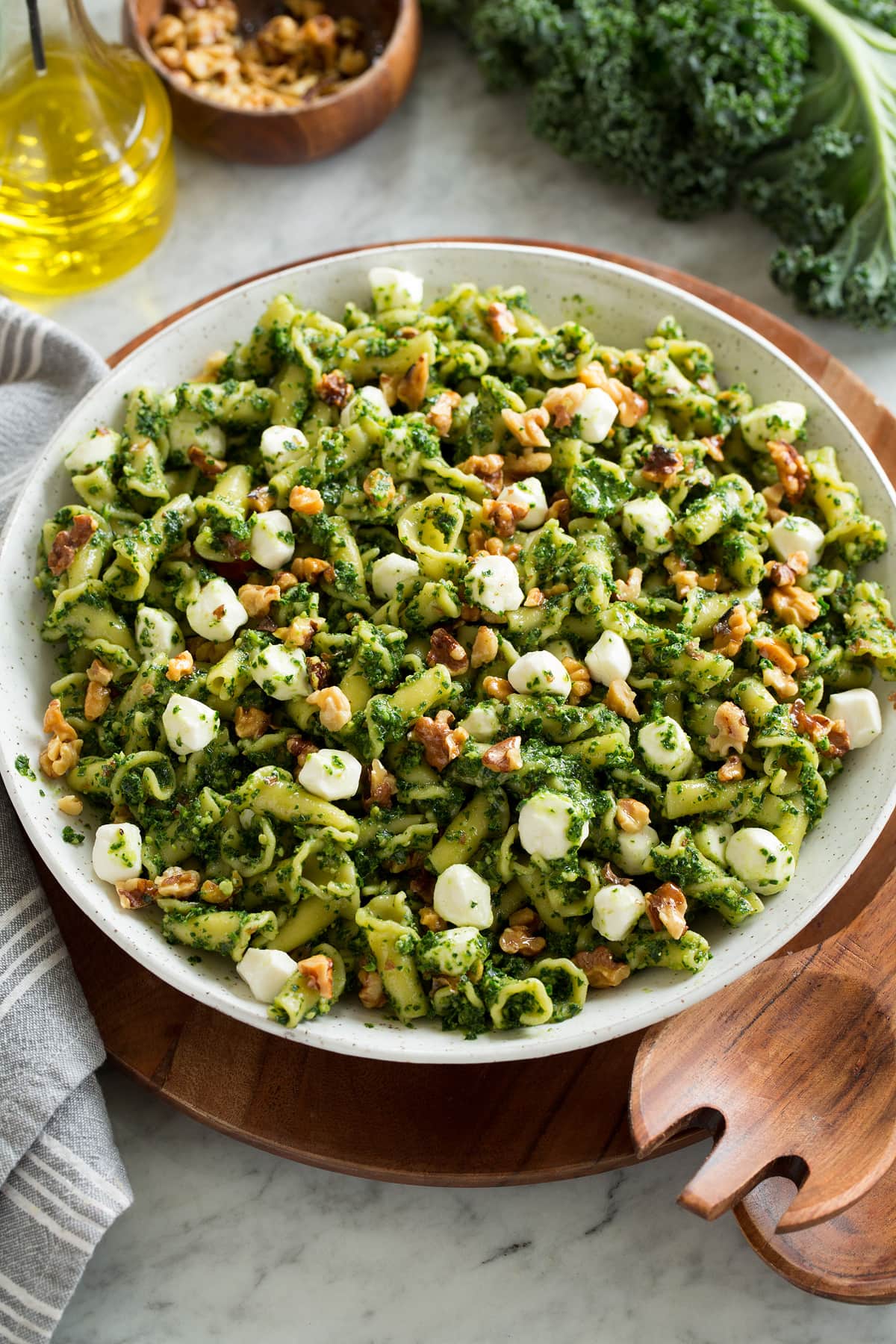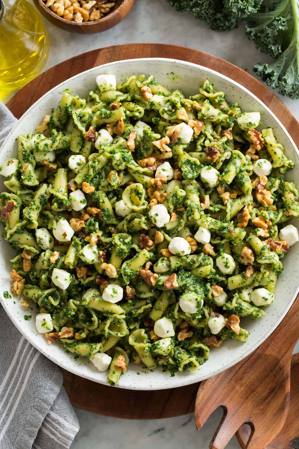 Here I tossed kale pesto with 1 lb. Campanelle pasta (cooked in salted boiling water and drained), add splashes of pasta cooking water to thin, and finished with fresh mozzarella pearls, and plenty of toasted chopped walnuts.