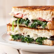 - Heat 1 tsp olive oil in a non-stick 10-inch skillet over medium-high heat. Once hot, add garlic and spinach and saute until spinach begins to wilt, about 30 seconds. Remove from heat, stir in basil and set aside. To assemble sandwich, spread Mozzarella and Feta cheese over one slice of bread into an even layer. Layer tomatoes in a single layer over cheese. Spread spinach mixture over tomatoes then sprinkle olives and red onions over tomatoes. Season with freshly ground black pepper and top with remaining slice of bread.