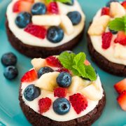 If you want to go the easier route with these, bake the brownies in a whoopie pie pan orĀ bake in the 13 by 9-inch pan and donāt cut circles. Instead simply frostĀ the whole layer of brownies, top with fruit then cut int squares. Either way everyone is going to love them!