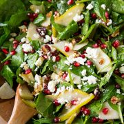 Pear, Pomegranate, and Spinach Salad is a colorful, healthy, and flavor-packed salad that’s perfect for your holiday menu. Bright spinach is topped with salty feta, tender pear slices, pomegranate seeds, toasted walnuts or pecans for crunch, and a tangy apple cider vinaigrette. This is the perfect Christmas salad, Thanksgiving side dish, or delicious fall lunch.