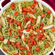 Isn’t pesto one of the best foods ever created? The flavor is so bold and vibrant, and when it’s homemade it’s just bursting with fresh flavor. It makes for one of the easiest and best pasta sauces, plus it’s healthy! Add it to spaghetti with some sweet roasted cherry tomatoes and some perfectly grilled chicken strips and you’ve got a meal worth remembering!