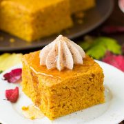 This cornbread is so soft and moist, I hate dry cornbread so of course I made this to be completely the opposite. I love that this has plenty of pumpkin flavor – you don’t have to guess what flavor of cornbread it is, and the whipped cinnamon honey butter just takes it over the top!