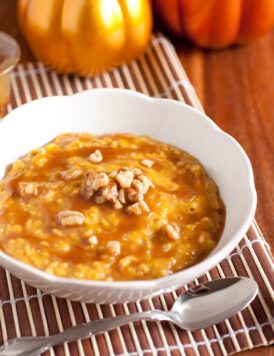 Pumpkin Pie Oatmeal with Caramel Sauce