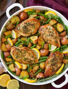 In the past I have never really opted for chicken thighs, most always I cook with chicken breasts. But, recently I was doing some sponsored work that called for using chicken thighs and actually loved them! It’s just been so long since I’ve given them a chance I guess. I just love the way the skin browns to golden crisp deliciousness in the roasting pan, the depth of flavor they had, and of course how tender the chicken was when you choose bone-in cuts. With some fresh lemon and herbs, they create a simple entree with tempting flavors. You can’t beat the crispy outside of the chicken with the tender meat inside. This would also work well with a whole chicken.
