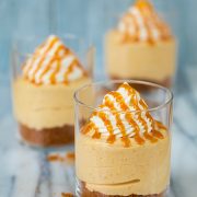 No Bake Pumpkin Cheesecakes with Caramel Sauce are the easiest way to whip up a luxurious autumn dessert that everyone will love. No baking, no water bath, no oven, no springform pan, no fuss! Cream cheese and heavy cream are whipped with pumpkin puree and pumpkin pie spice until fluffy and cloudlike, then layered over a Biscoff crust and topped with a dollop of whipped topping.Â