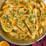 Chicken tenders with bright citrus flavors! Who doesn’t love a quick and easy skillet chicken recipe? Skillet chicken has become a go-to dinner option for me because we eat a lot of lean chicken around here and it’s one of the quickest ways to cook it.