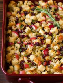 This stuffing is packed with fresh herbs, freshly dried bread cubes (I listed store-bought bread cubes as an option just in case you don’t have time to make your own), and has the perfect amount of butter and veggies.