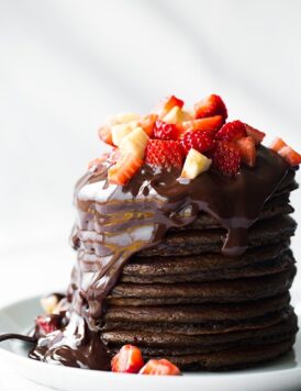 Chocolate Pancakes {with Chocolate Sauce, Strawberries and Bananas}