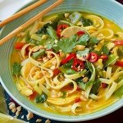 Thai Coconut Curry Chicken Soup is a hearty vegetable, chicken and noodle based soup with vibrant fresh Thai flavors! And you’ll love the addition of crunchy peanuts to finish it off. It’s the perfect soup recipe to make year round.