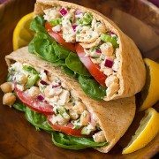 Healthy, hearty tuna sandwiches. Flaky tuna and tender chick peas are coated with a bright and creamy, lemon herb dressing then added to whole wheat pita pockets along with fresh spinach and tomatoes.